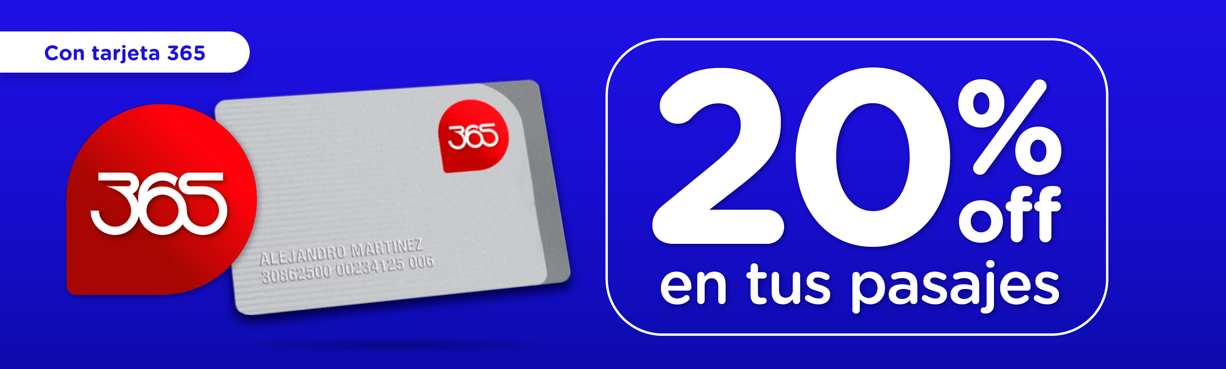 – Este descuento solo aplica al usuario registrado en 365. En caso de realizar una compra que incluya varios pasajeros, el descuento solo aplicará a usuarios registrados y validados en 365, es decir que el descuento no aplicará a toda la compra.